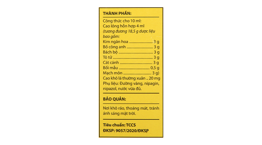 Cao lỏng hỗn hợp 4ml (tương đương 18,5g dược liệu gồm: Kim ngân hoa 3g; Bồ công anh 3g; Bách bộ 3g; Tô tử 3g; Cát cánh 3g; Bối mẫu 3g; Mạch môn 3g).