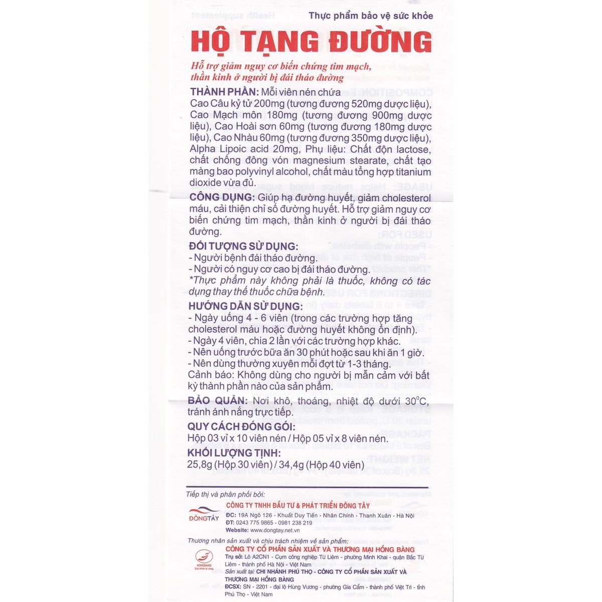 Viên uống Hộ Tạng Đường hỗ trợ ngăn ngừa biến chứng tiểu đường (30 viên)