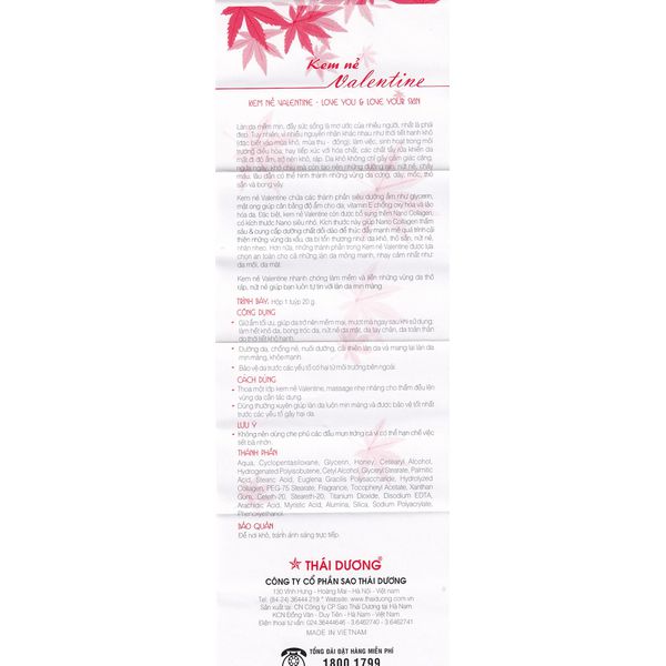 Kem trị nẻ Valentine Sao Thái Dương là dòng sản phẩm hiệu quả trong việc cung cấp độ ẩm, dinh dưỡng cần thiết cho một làn da căng bóng tự nhiên, khỏe mạnh từ sâu bên trong. Nhờ các thành phần vàng trong khả năng dưỡng ẩm như mật ong, Glycerin, vitamin E và Nano Collagen, sản phẩm dưỡng ẩm chuyên sâu, thúc đẩy tái tạo các vùng da kém thẩm mỹ: sần sùi, nứt nẻ, bong tróc da.