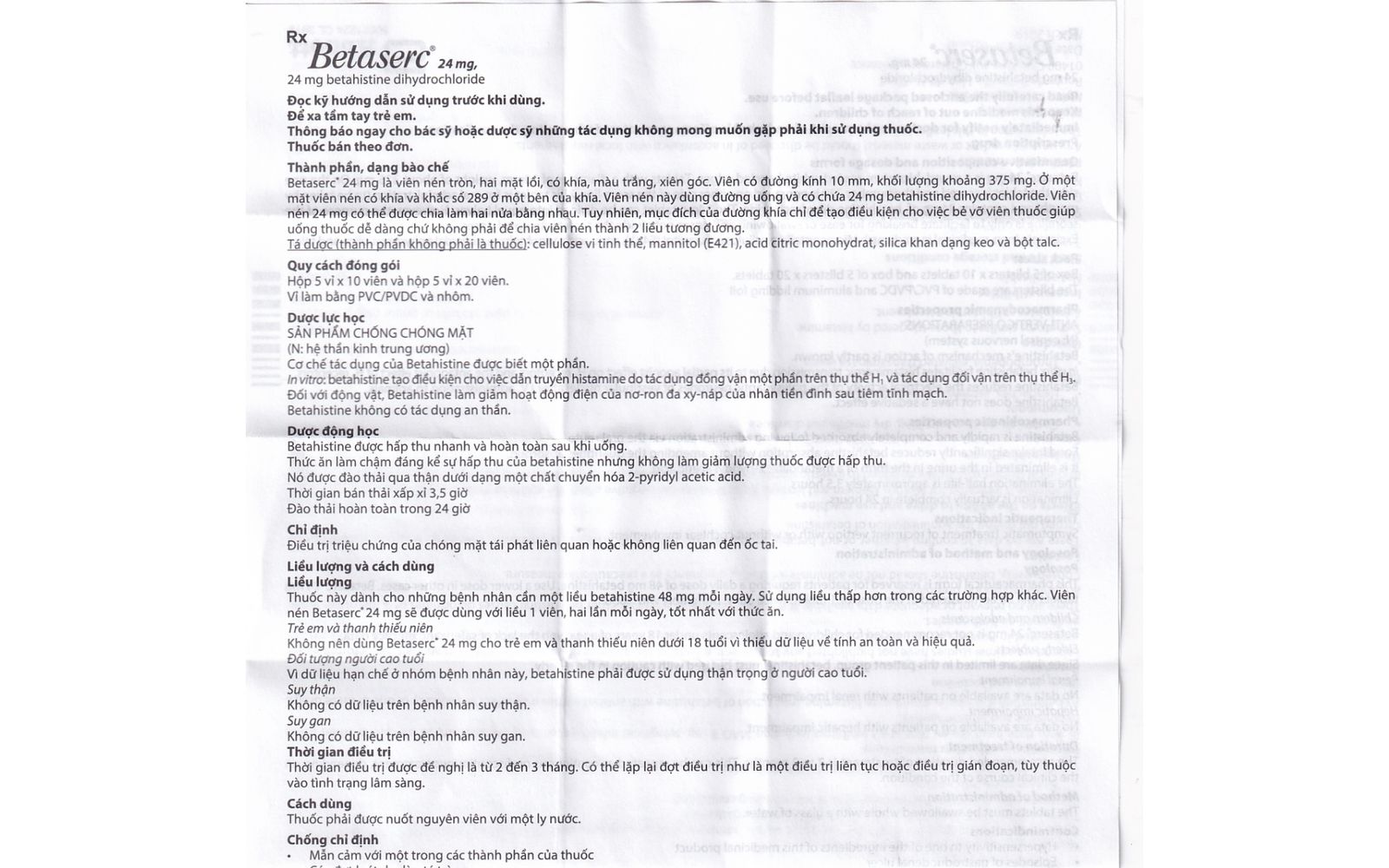 Người lớn: Thuốc này dành cho những bệnh nhân cần một liều Betahistine 48 mg mỗi ngày. Sử dụng liều thấp hơn trong các trường hợp khác. Viên nén Betaserc 24 mg sẽ được dùng với liều 1 viên, hai lần mỗi ngày, tốt nhất với thức ăn.