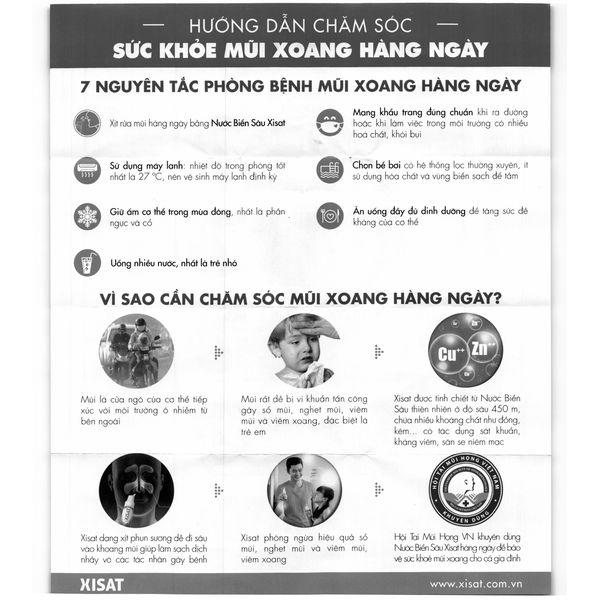 Thuốc xịt mũi Xisat có tác dụng sát khuẩn, giảm viêm, làm loãng dịch nhầy và cải thiện tình trạng nghẹt mũi, sổ mũi do các bệnh lý nhiễm trùng đường hô hấp gây ra. Người bệnh có thể dùng chai xịt 3 – 6 lần/ngày theo hướng dẫn dưới đây để mũi được thông thoáng, sạch sẽ.